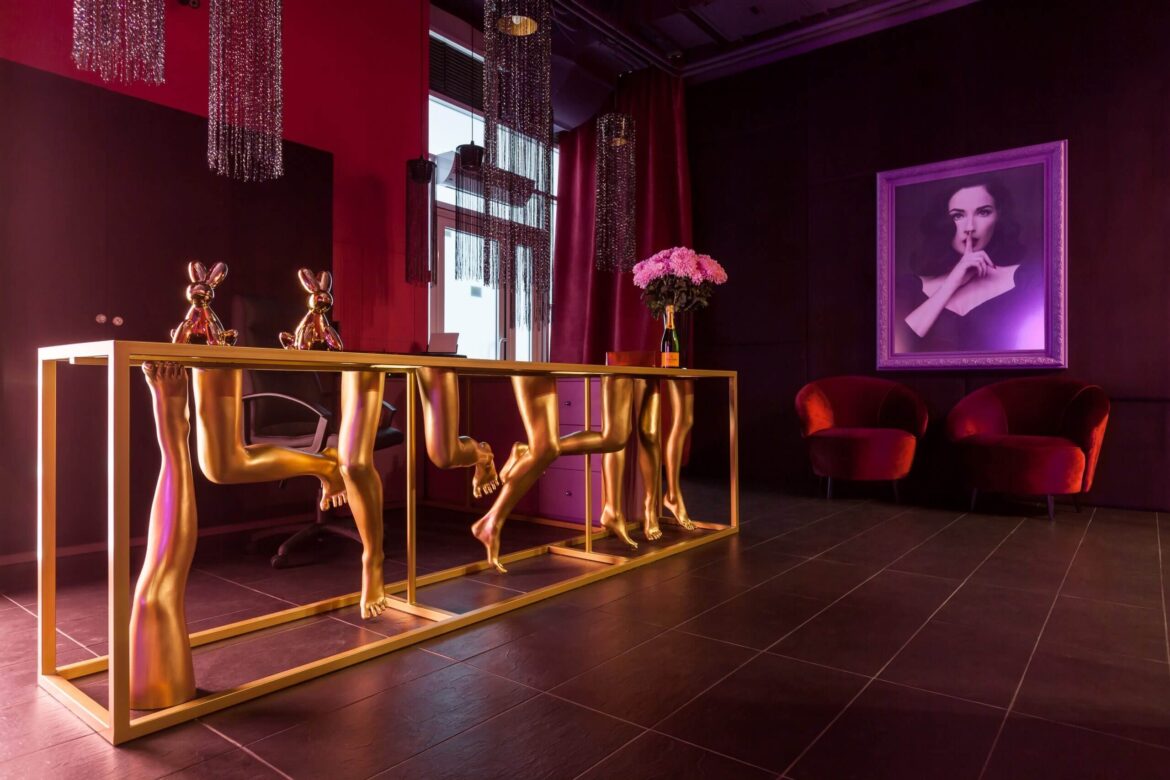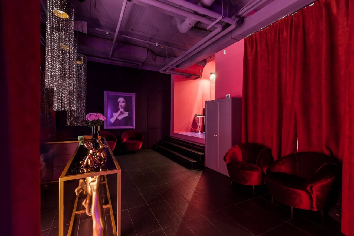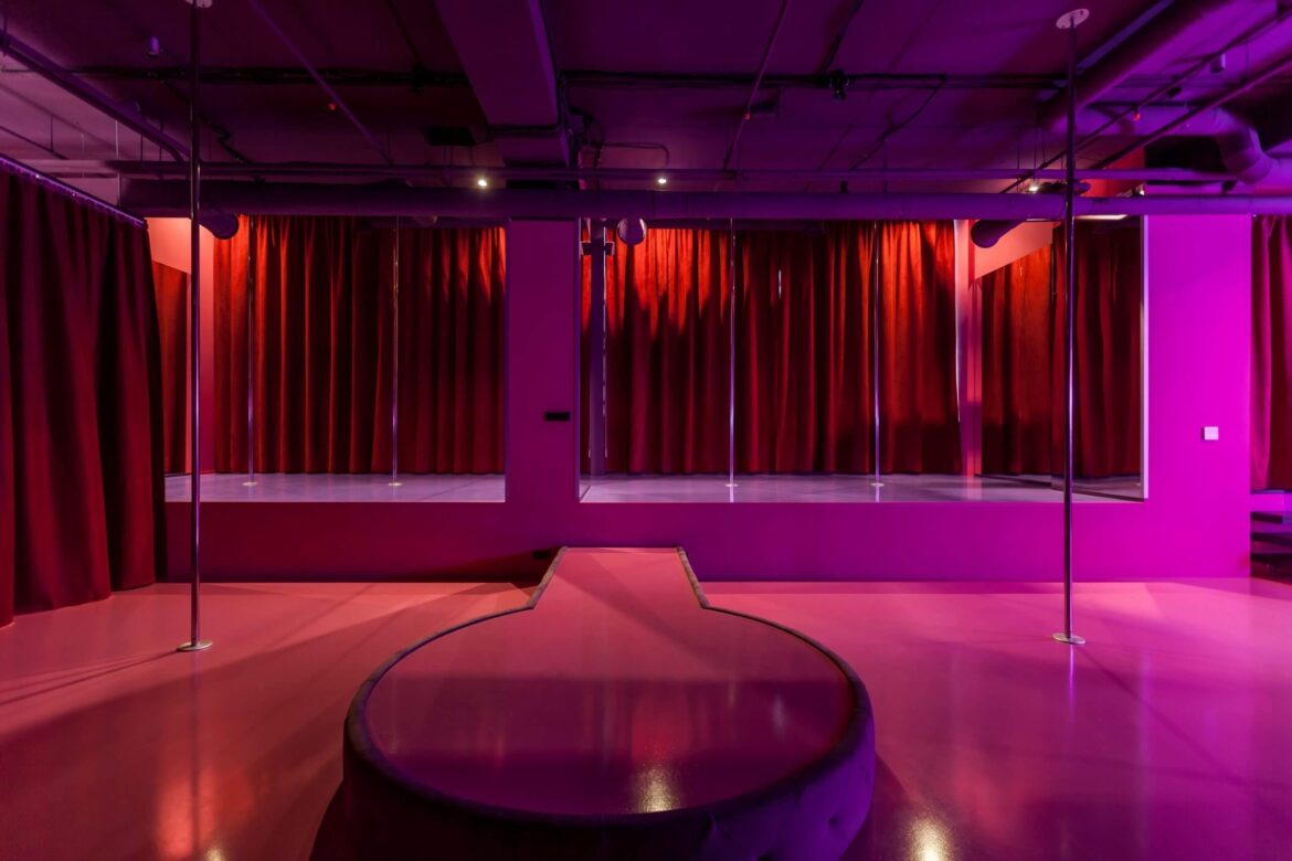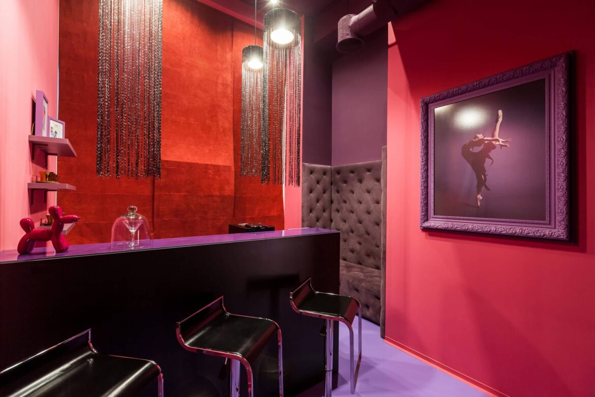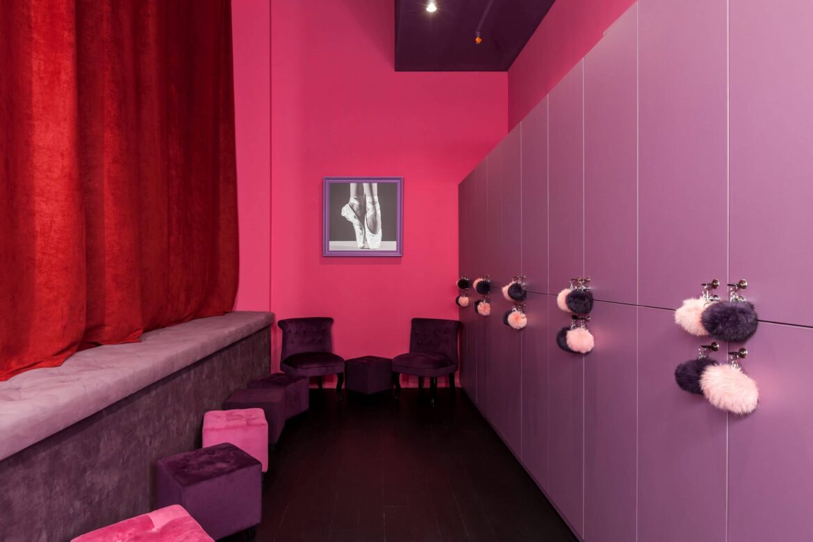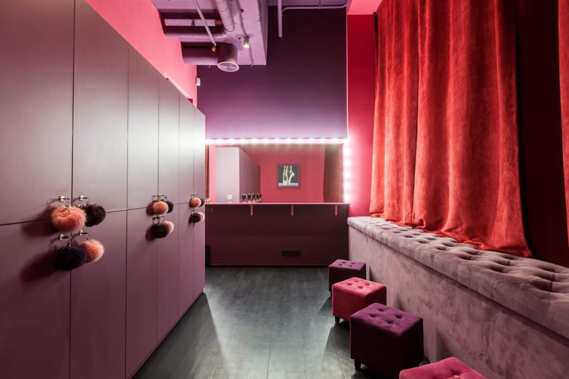 The studio took the matter seriously and carefully studied how similar schools operate in France. The foundation of the future space was based on cabaret colors: red and pink, and to add more authenticity, a portrait of burlesque star Dita Von Teese was included in the future interior.