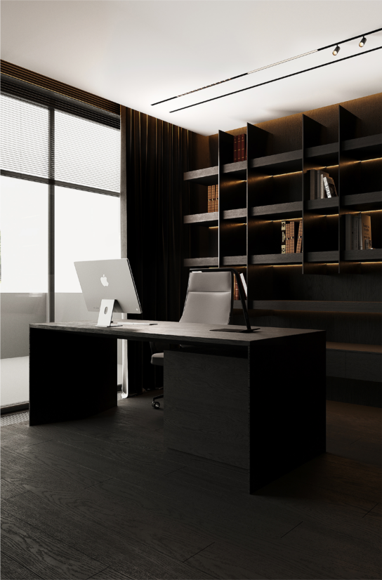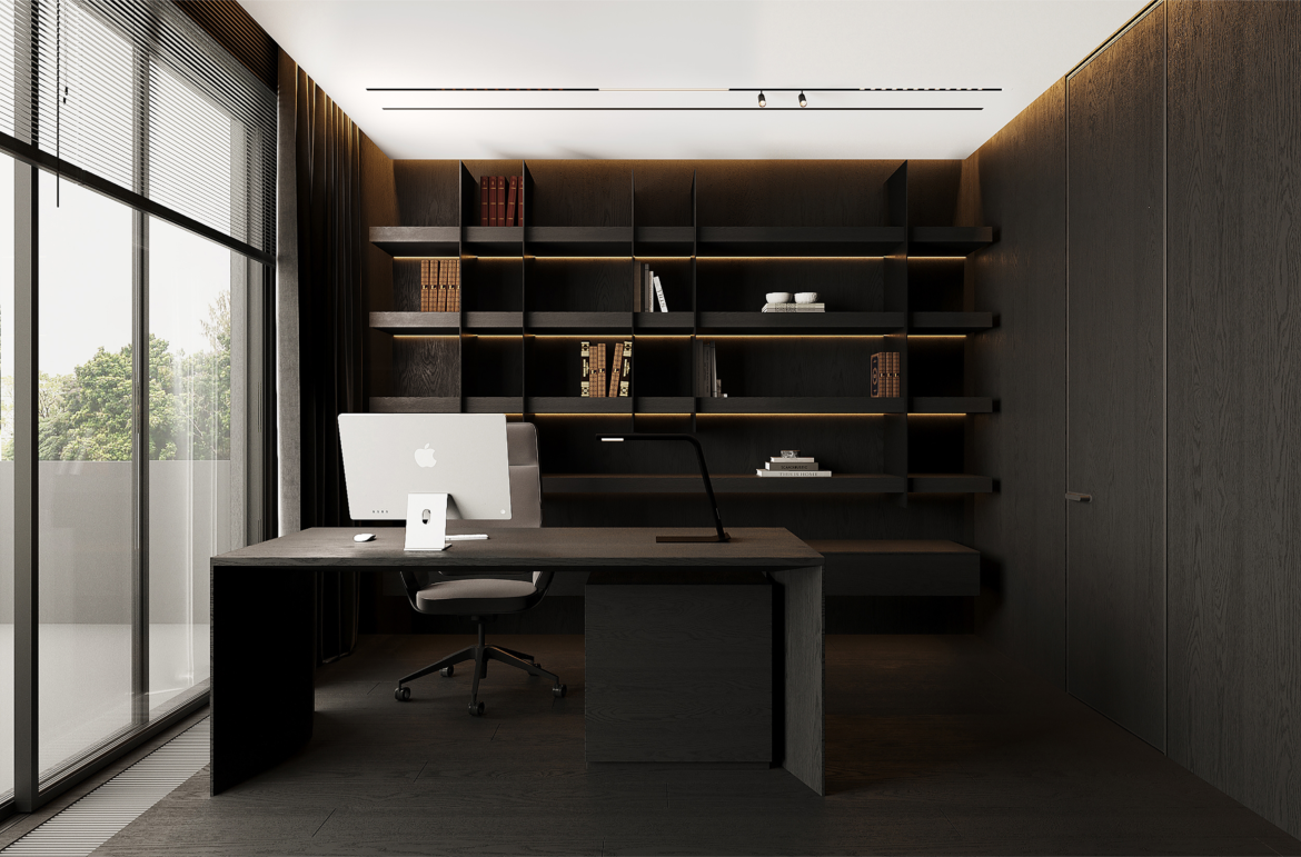 The office is minimalist and functional — open shelving, warm textures, and natural light make it ideal for focused work in a calm atmosphere.