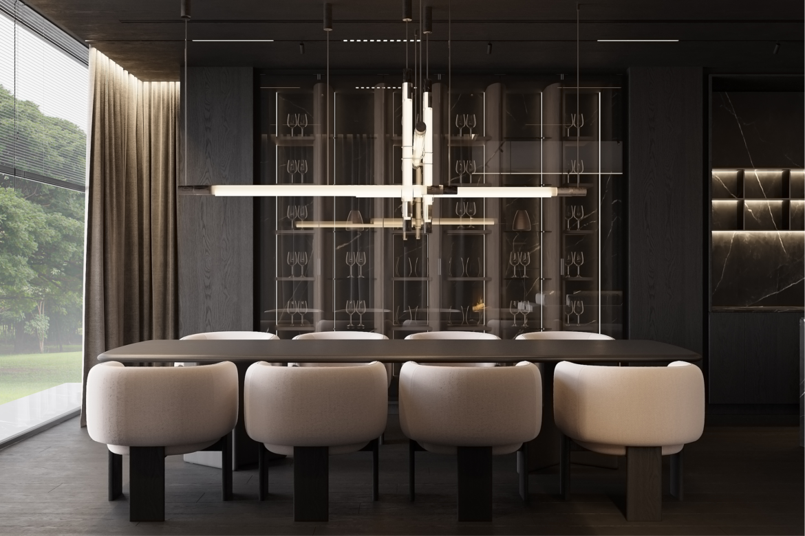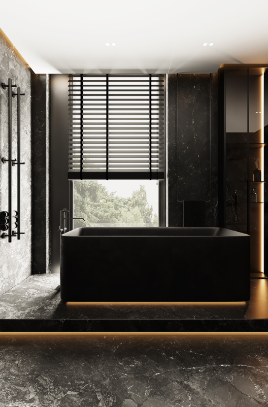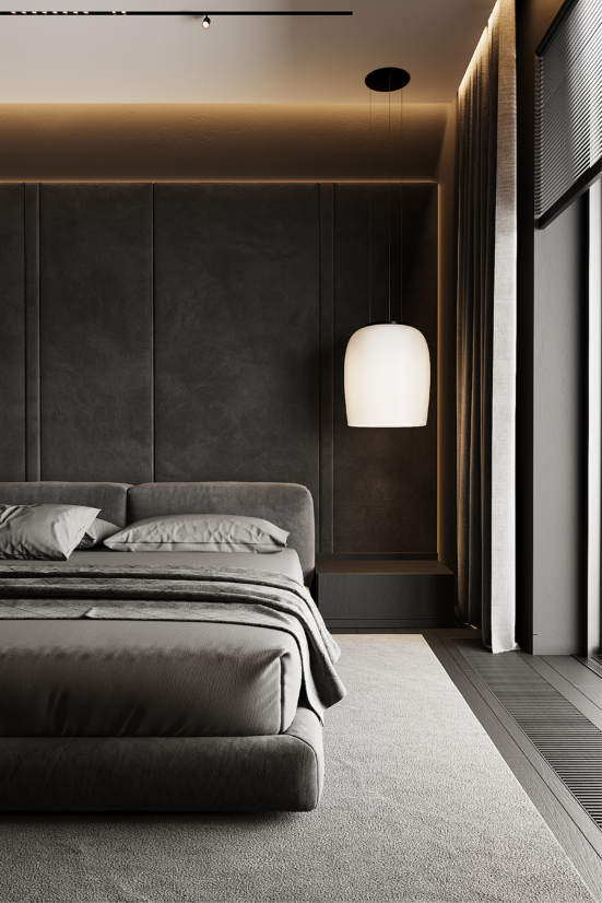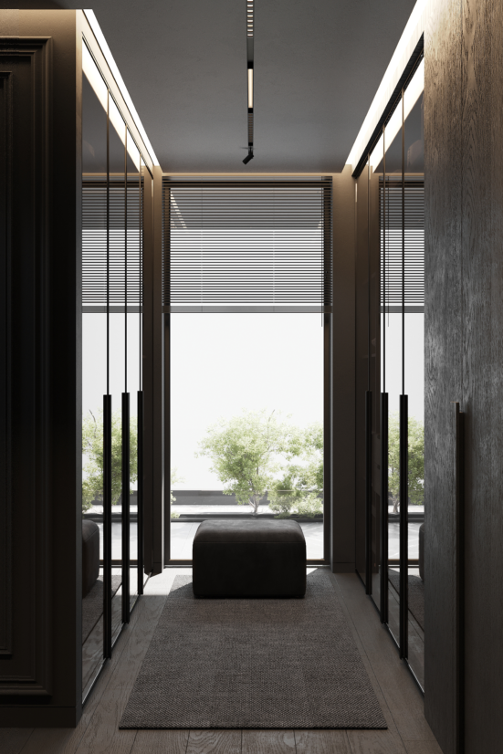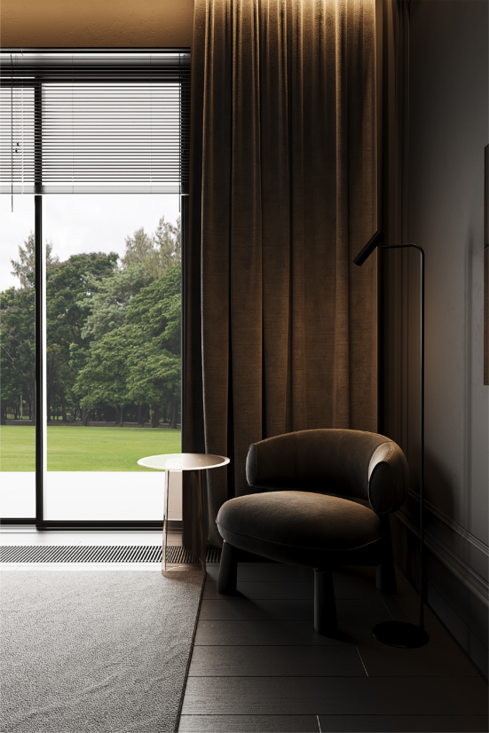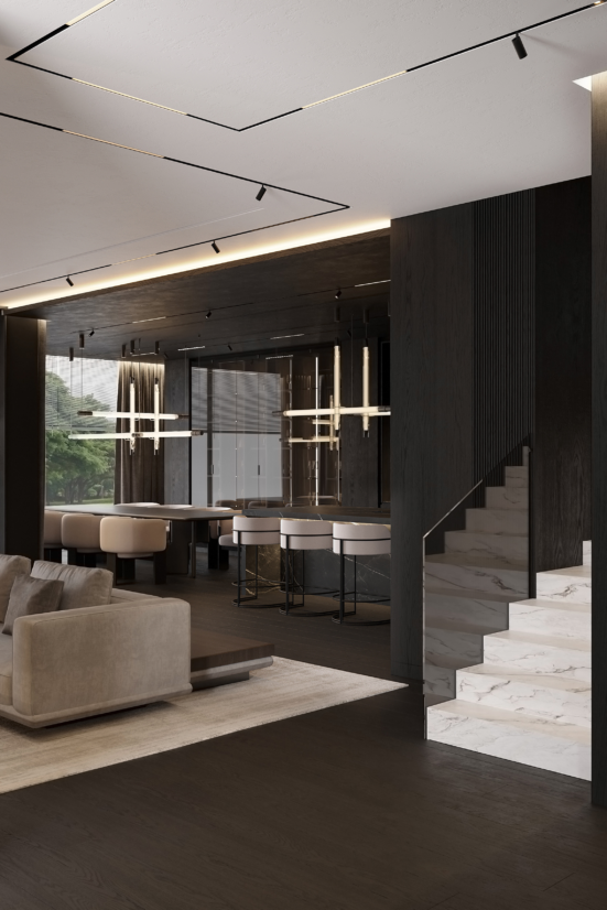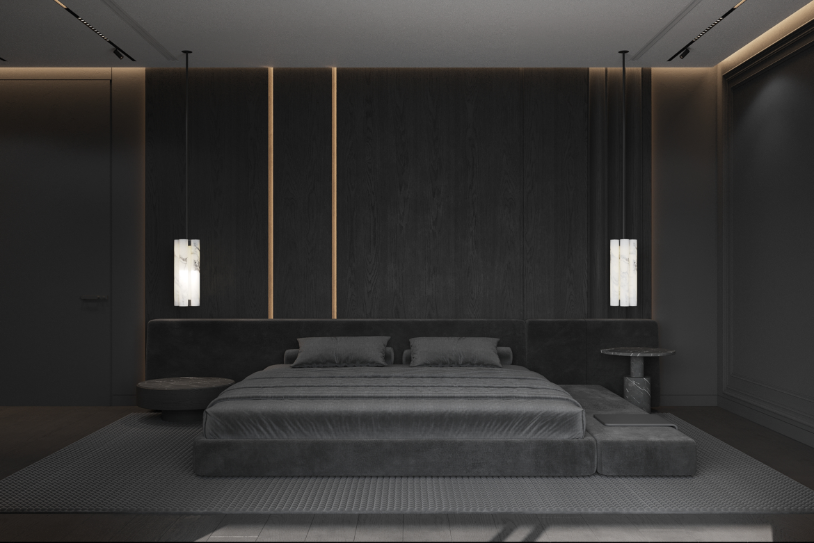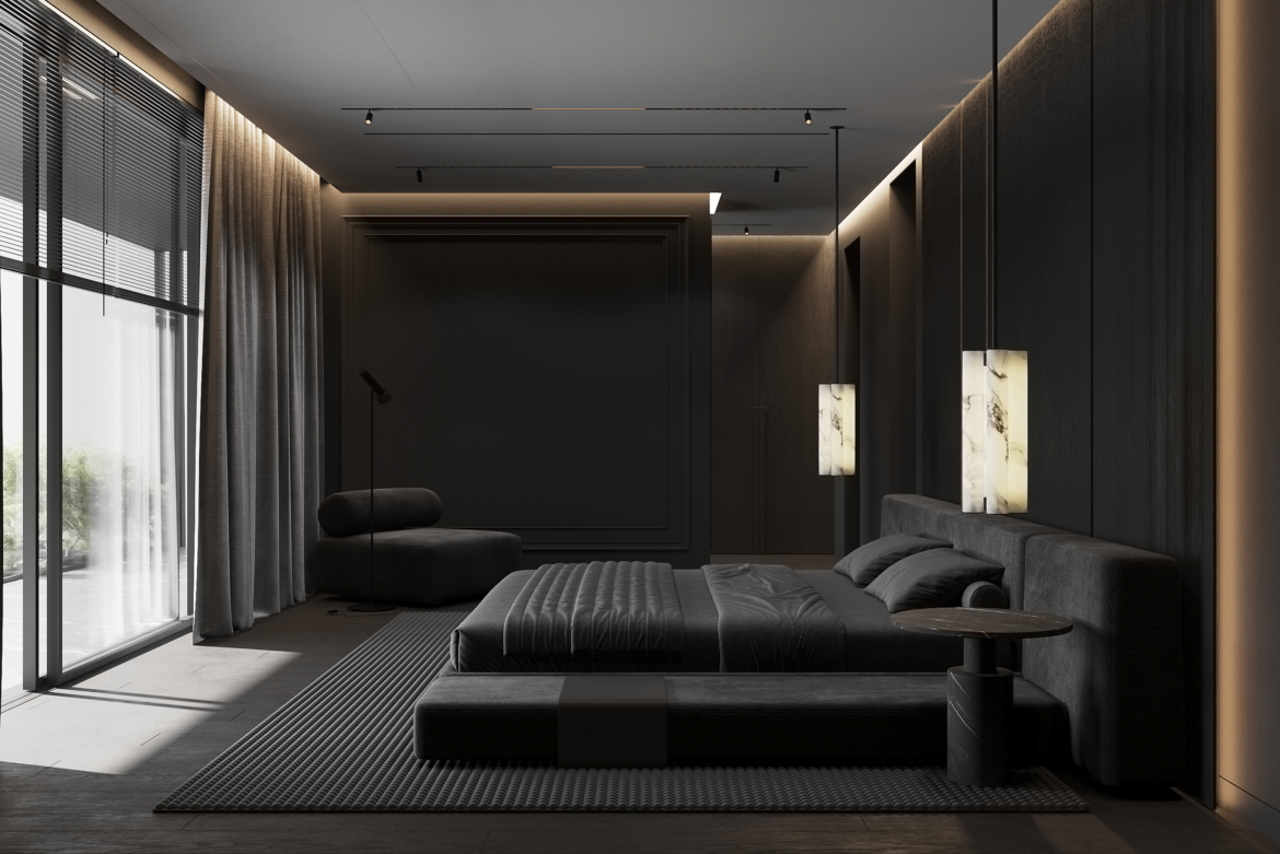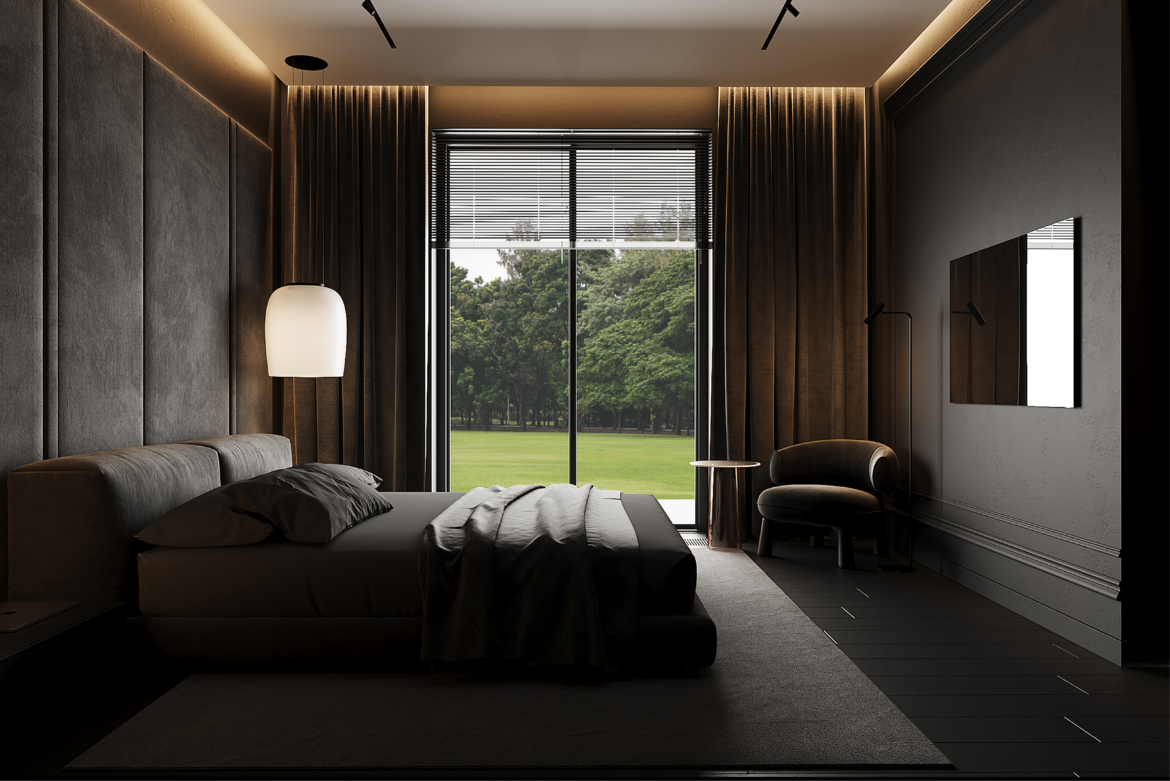 Upstairs, the master suite features a spacious bedroom, dressing room, and en-suite bathroom. Floor-to-ceiling windows, moody lighting, and dark tones create an elegant retreat. Most furniture was custom-designed specifically for the project.