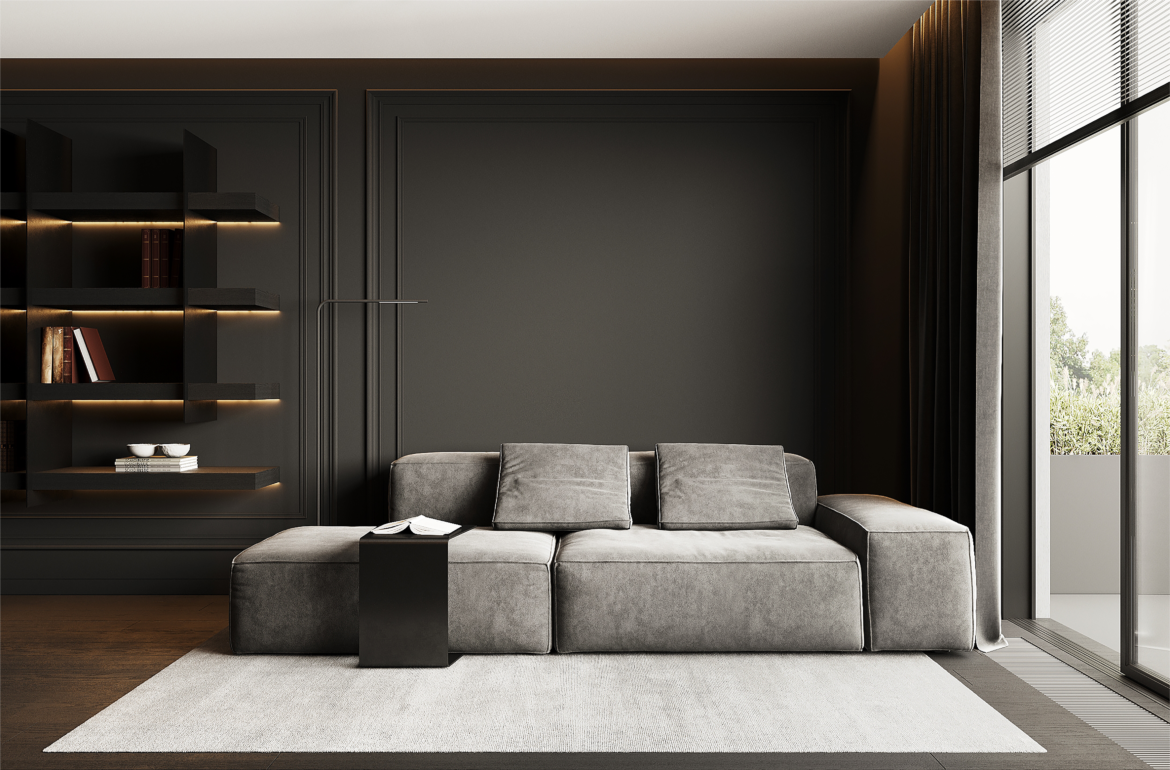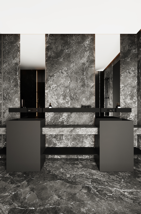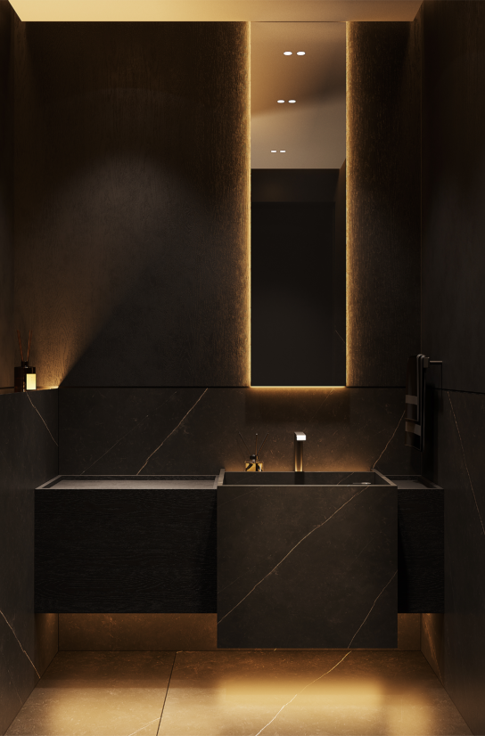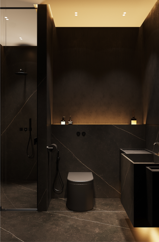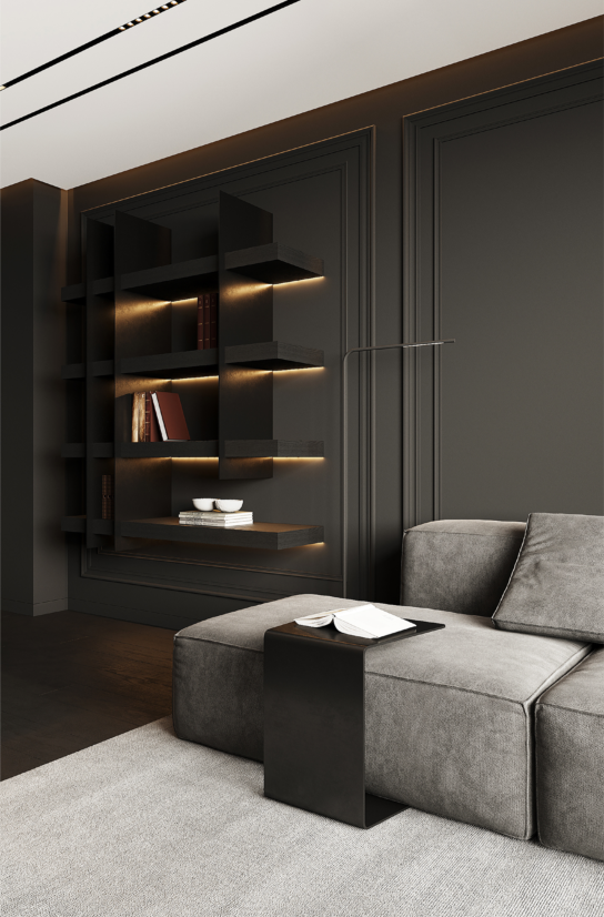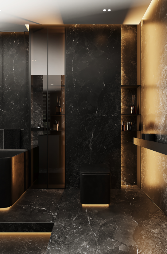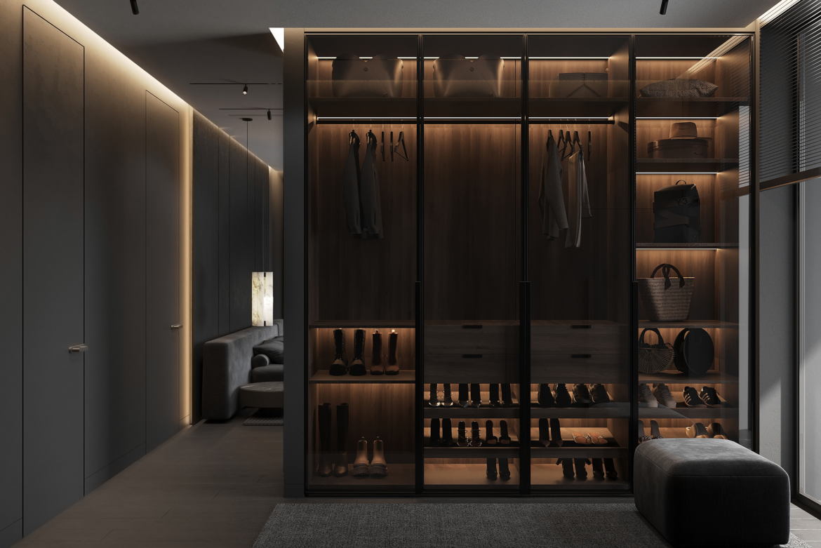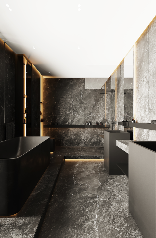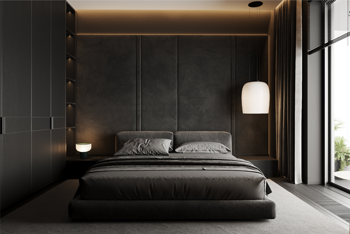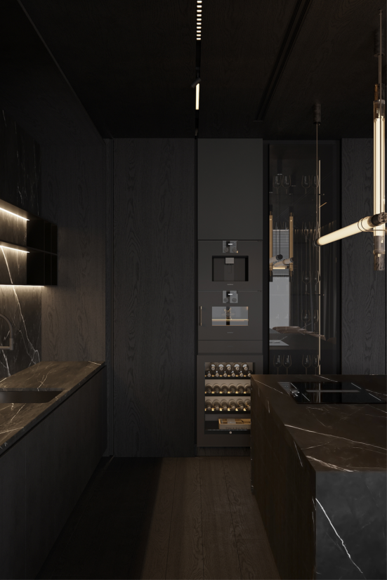 Upstairs, the master suite features a spacious bedroom, dressing room, and en-suite bathroom. Floor-to-ceiling windows, moody lighting, and dark tones create an elegant retreat. Most furniture was custom-designed specifically for the project.