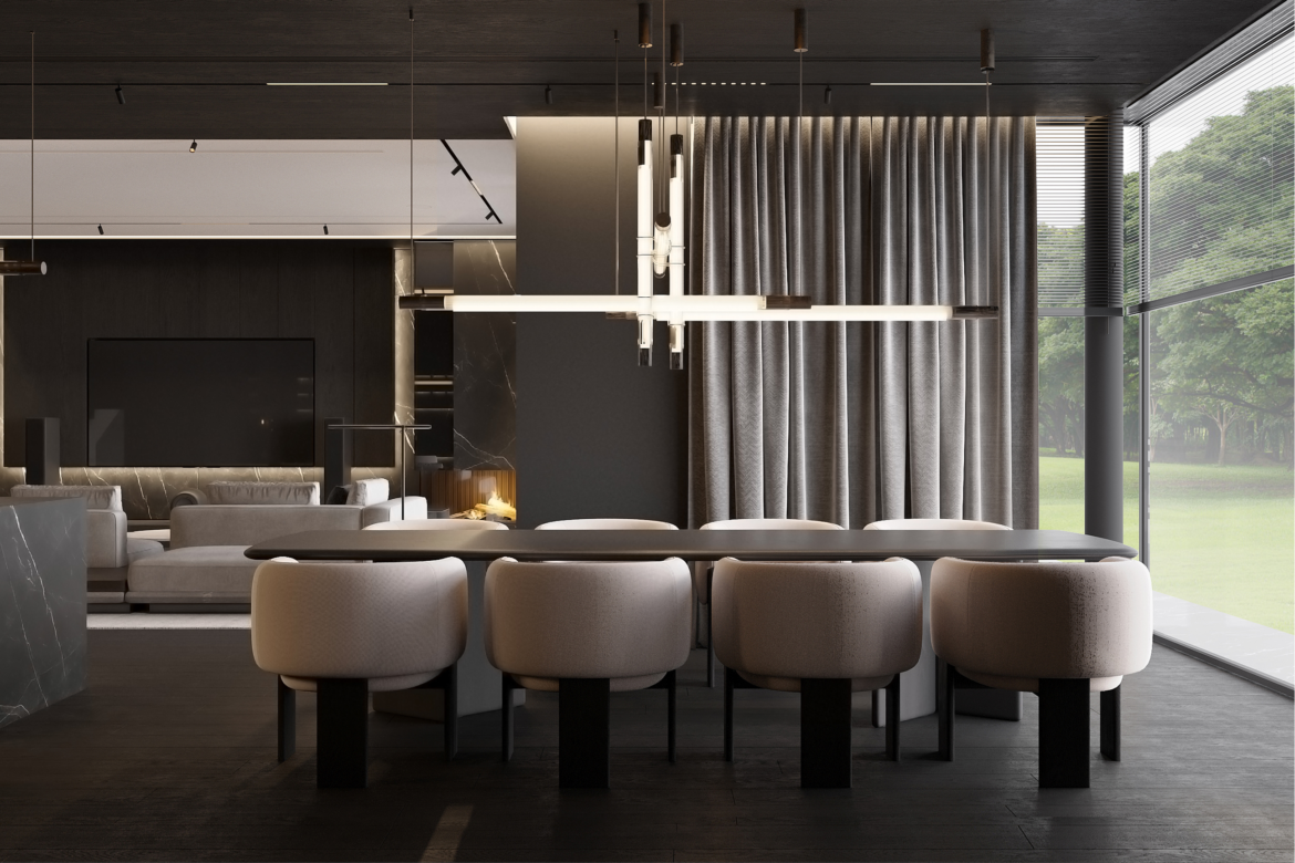 A fireplace adds warmth and ambiance. Above the dining table, we placed a lighting fixture by the Italian brand Henge, which also became an expressive accent in the overall composition of the space.