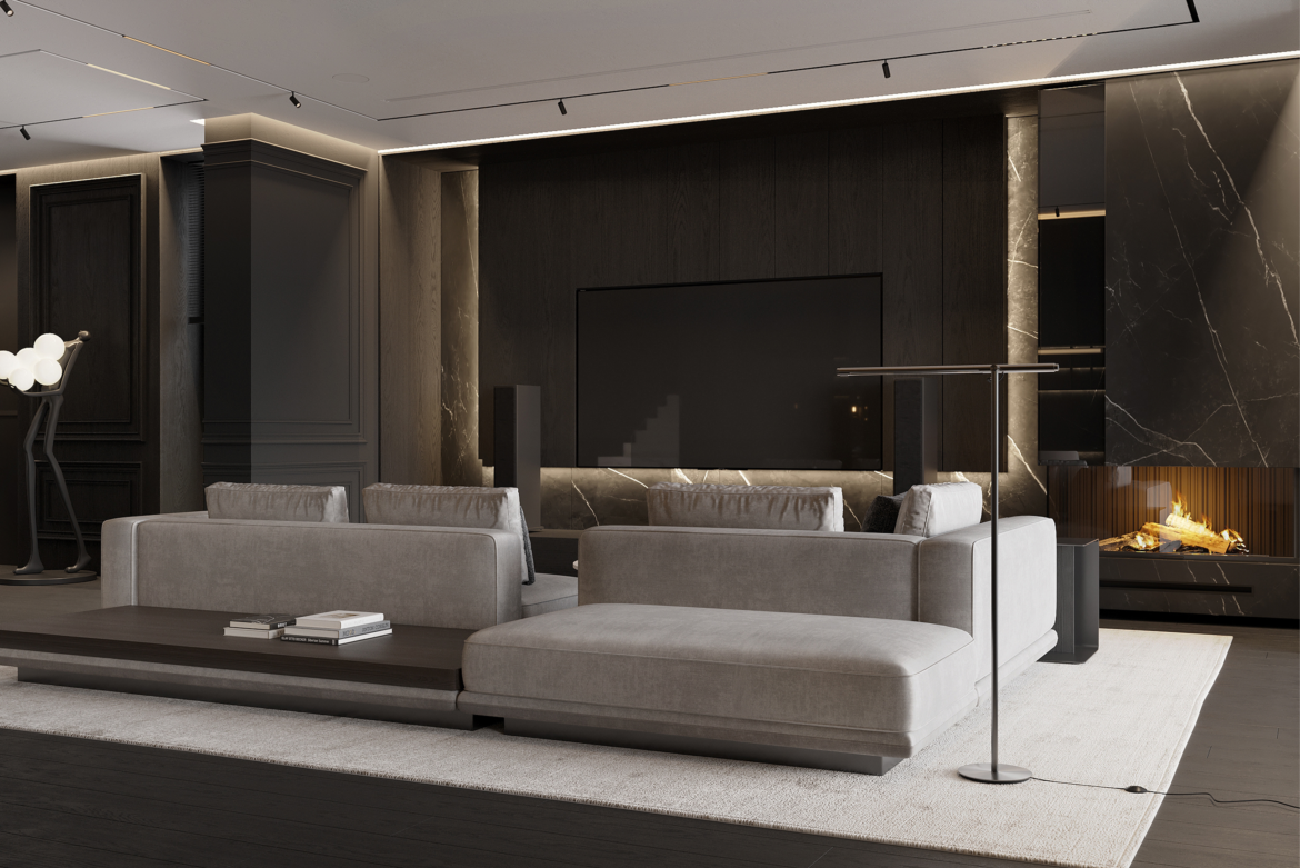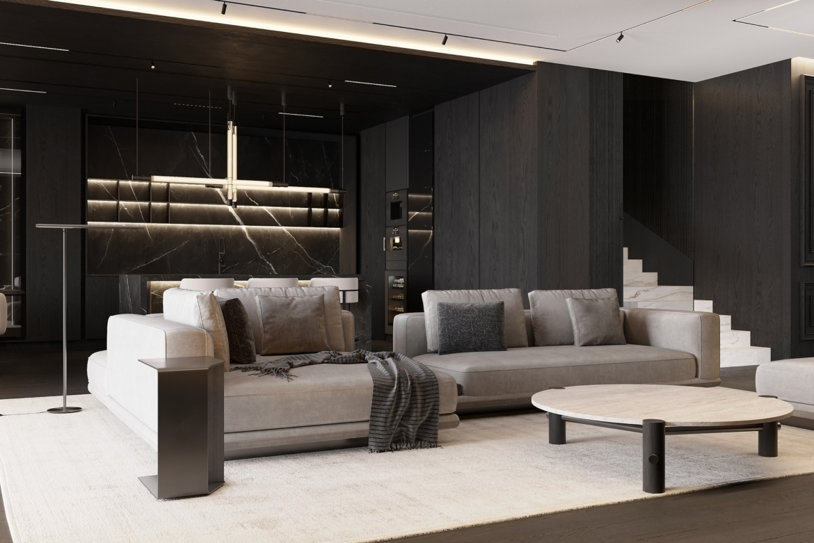 The dark color scheme is refined and balanced with classic detailing, panoramic windows, and custom lighting. The project also includes smart home technology and a mechanical ventilation system.