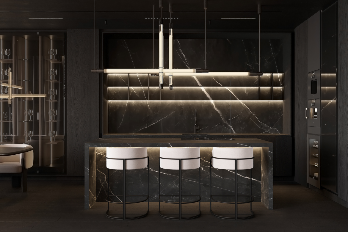 This two-story house was designed for those who value depth, aesthetics, and tactile materials. Natural stone, wood, and glass set the foundation, while the client’s love for dark tones guided the color palette. Still, the Yousupova team kept the space soft, cozy, and welcoming for the entire family.