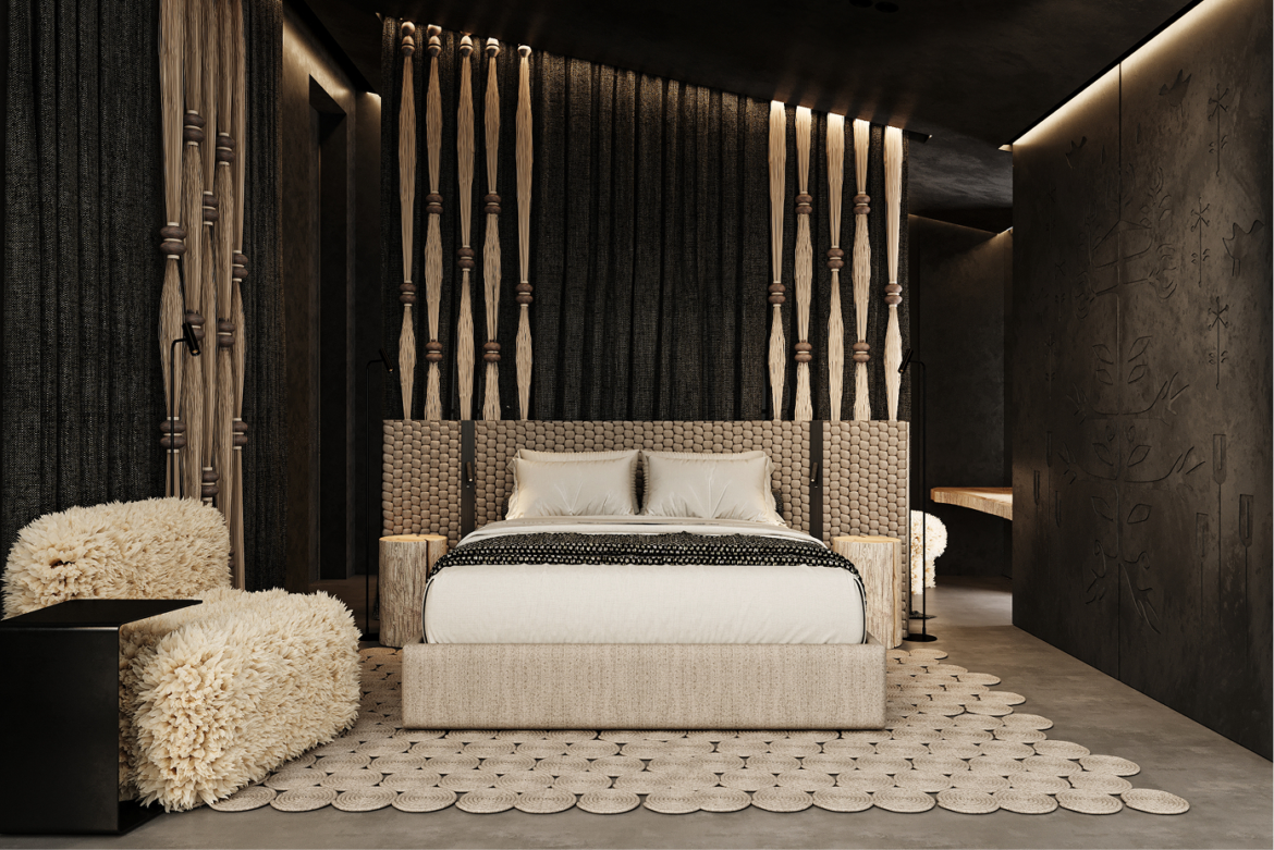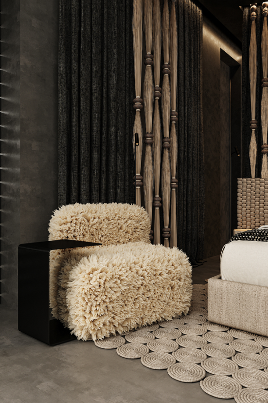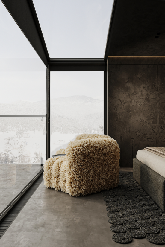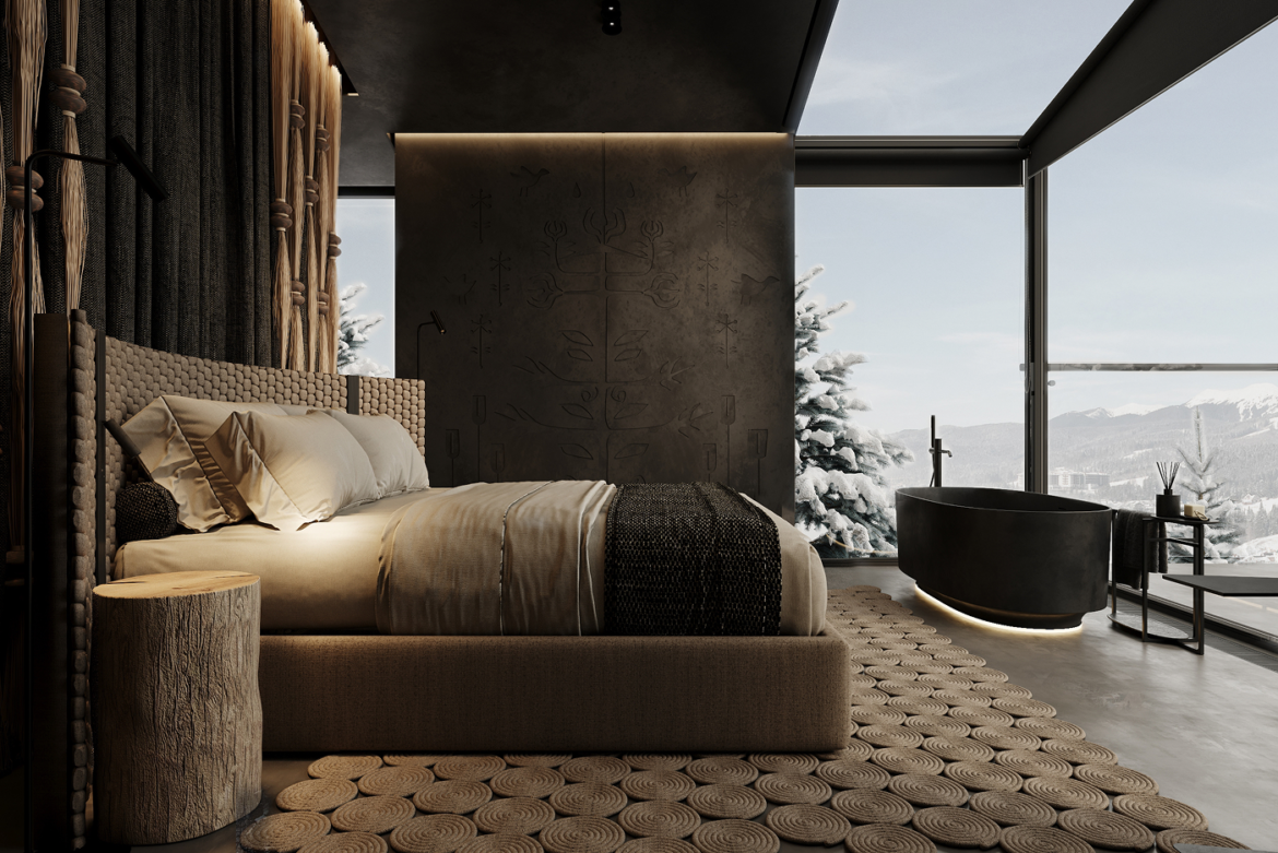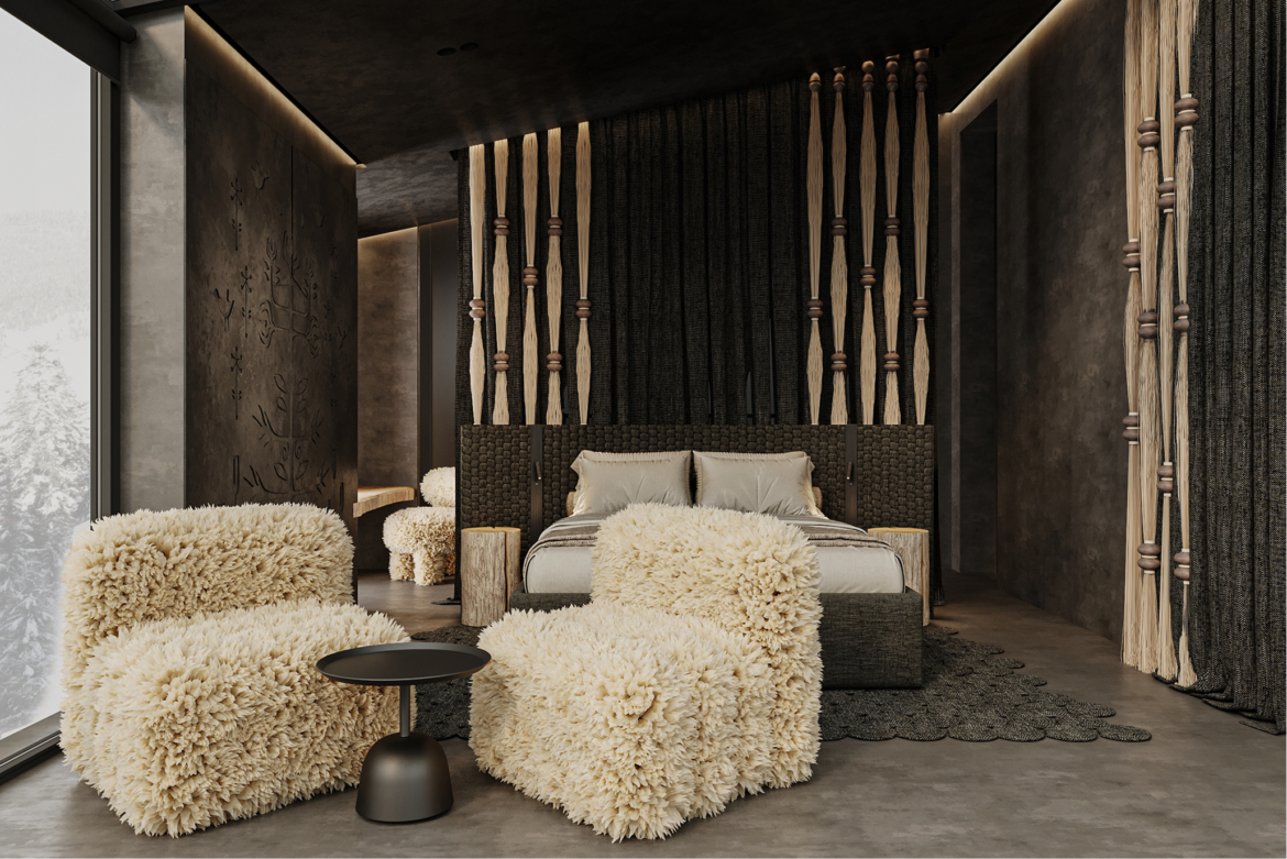 Every object carries its own presence. Bedside tables crafted like ancient tree stumps. A handwoven bed frame, raw and honest. Hand-knotted rugs. And chairs — a collaboration between Kyiv-based studio KINT and traditional Hutsul craftspeople from GUSHKA in Kosiv. Everything here is made in Ukraine — a tribute to local artisanship and soul.