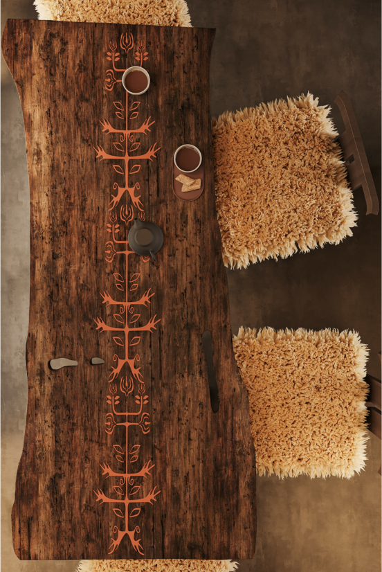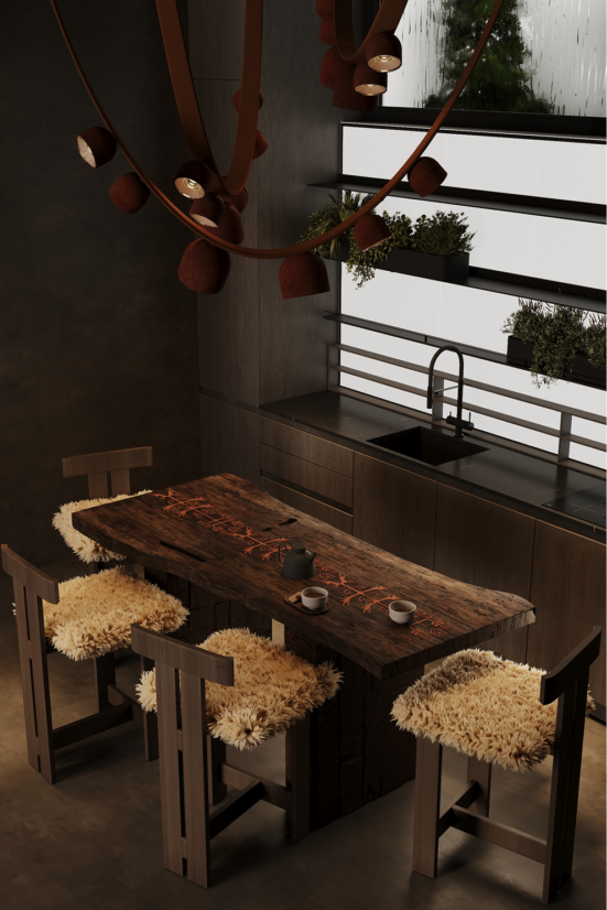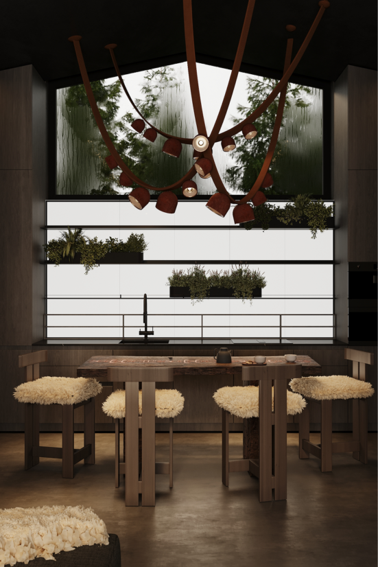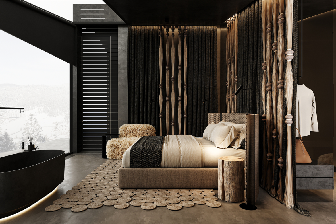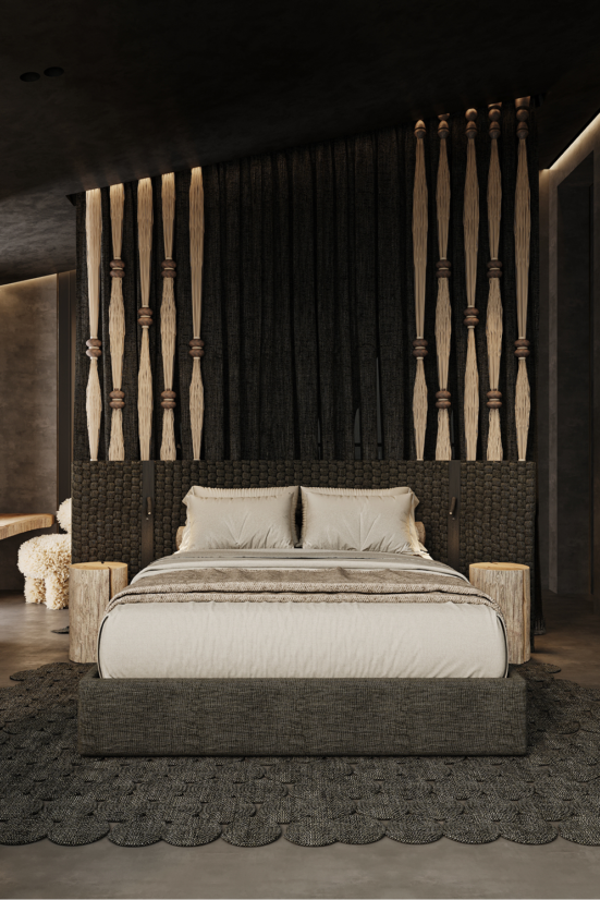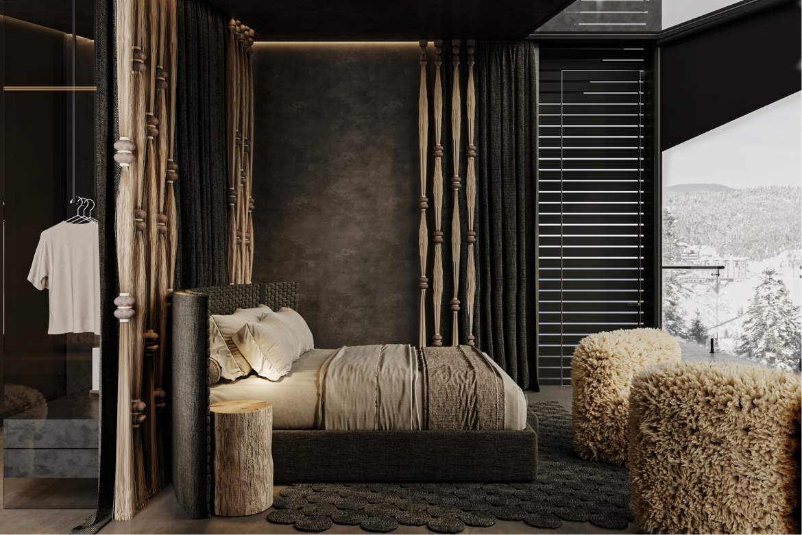 Every object carries its own presence. Bedside tables crafted like ancient tree stumps. A handwoven bed frame, raw and honest. Hand-knotted rugs. And chairs — a collaboration between Kyiv-based studio KINT and traditional Hutsul craftspeople from GUSHKA in Kosiv. Everything here is made in Ukraine — a tribute to local artisanship and soul.