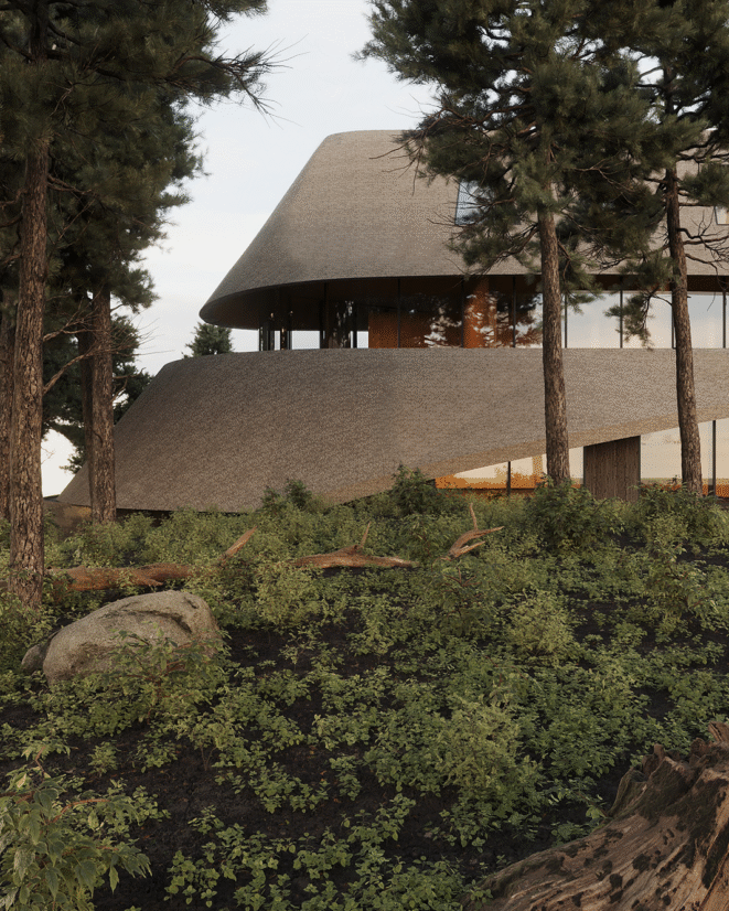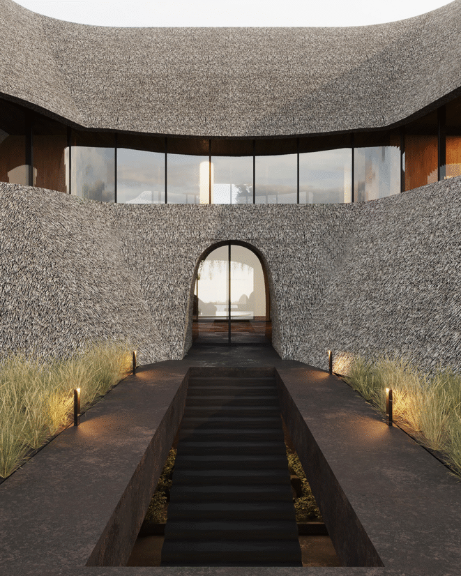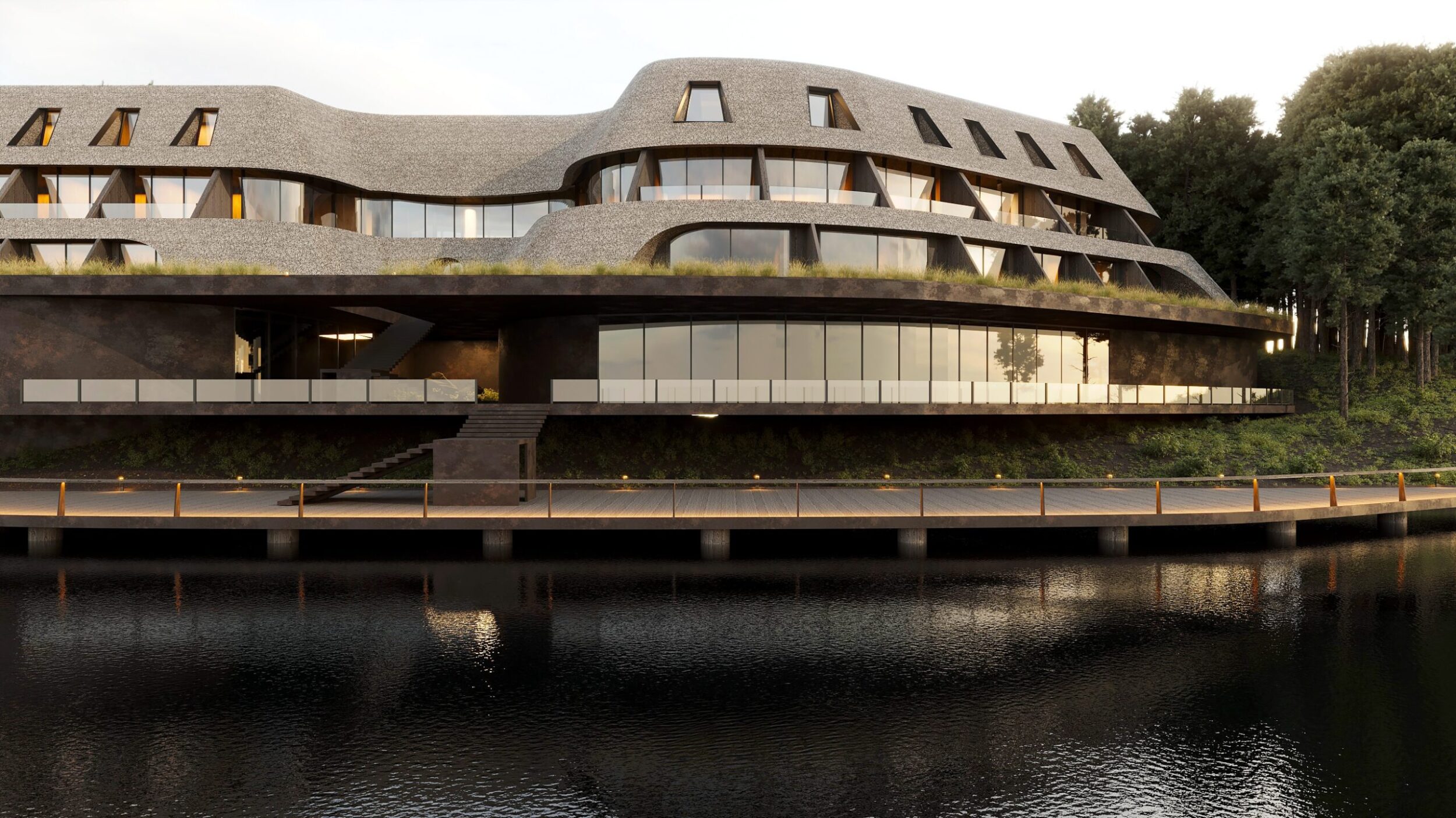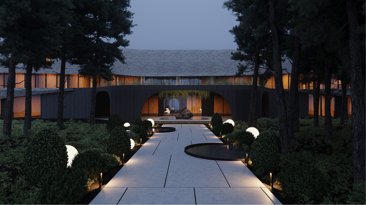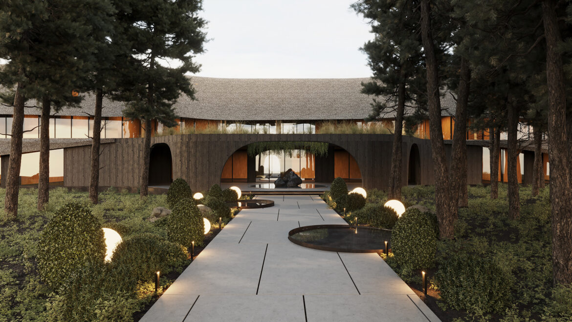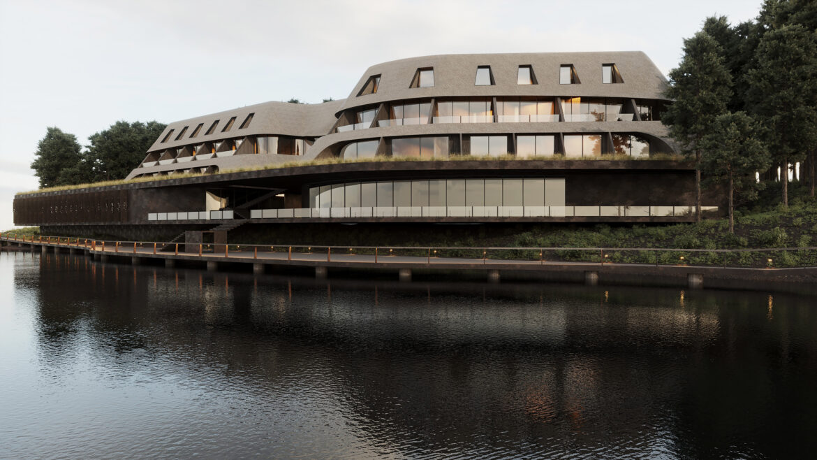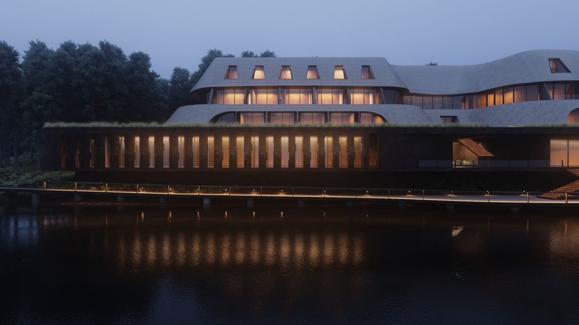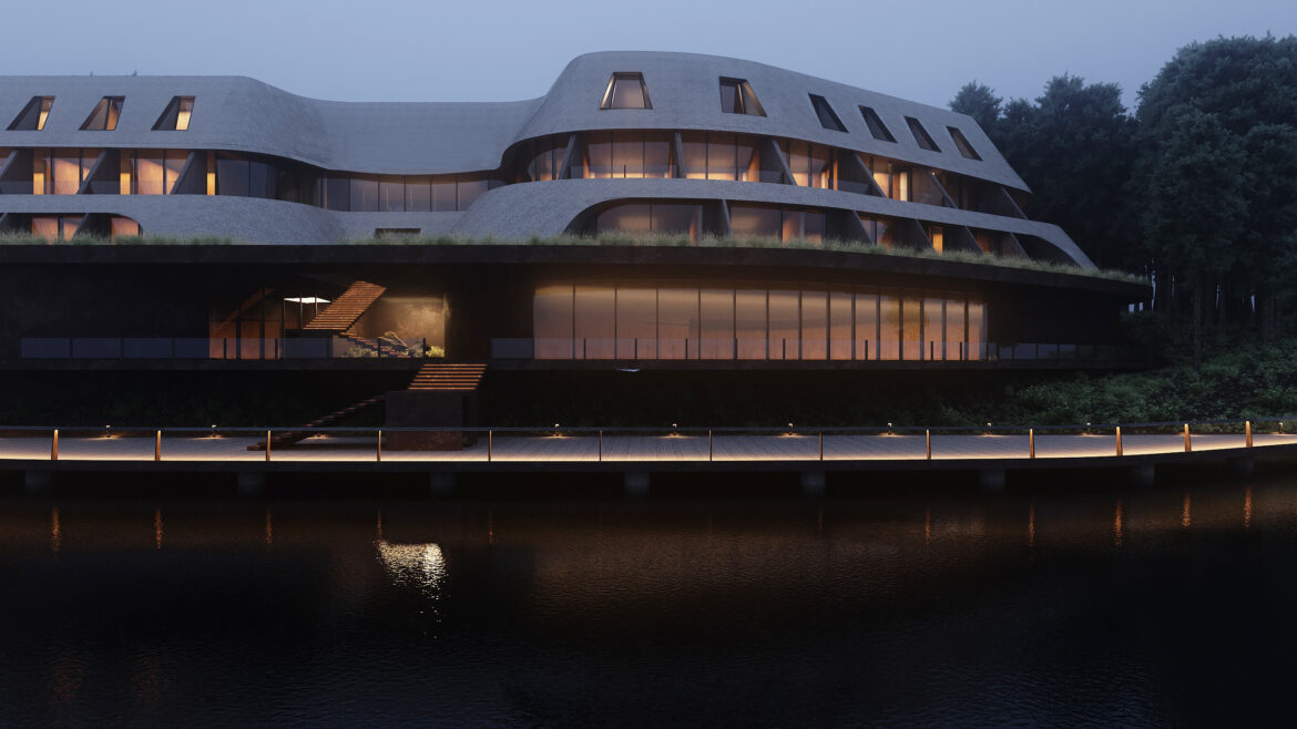Yousupova studio presents the exterior of a waterfront hotel that harmoniously blends Ukrainian cultural references with a contemporary architectural approach. The building’s organic silhouette is enhanced by a thatched roof, embracing current eco-design trends and bringing the architecture closer to its natural surroundings.