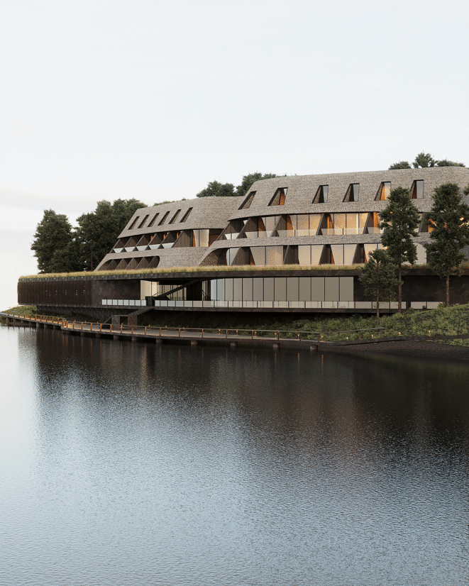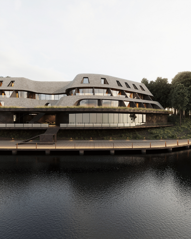 Panoramic views over the forest and water become a key visual anchor, turning the landscape into a defining element of the guest experience. The result is not just a place to stay, but a place to feel—deeply rooted in nature, yet elevated by thoughtful design.