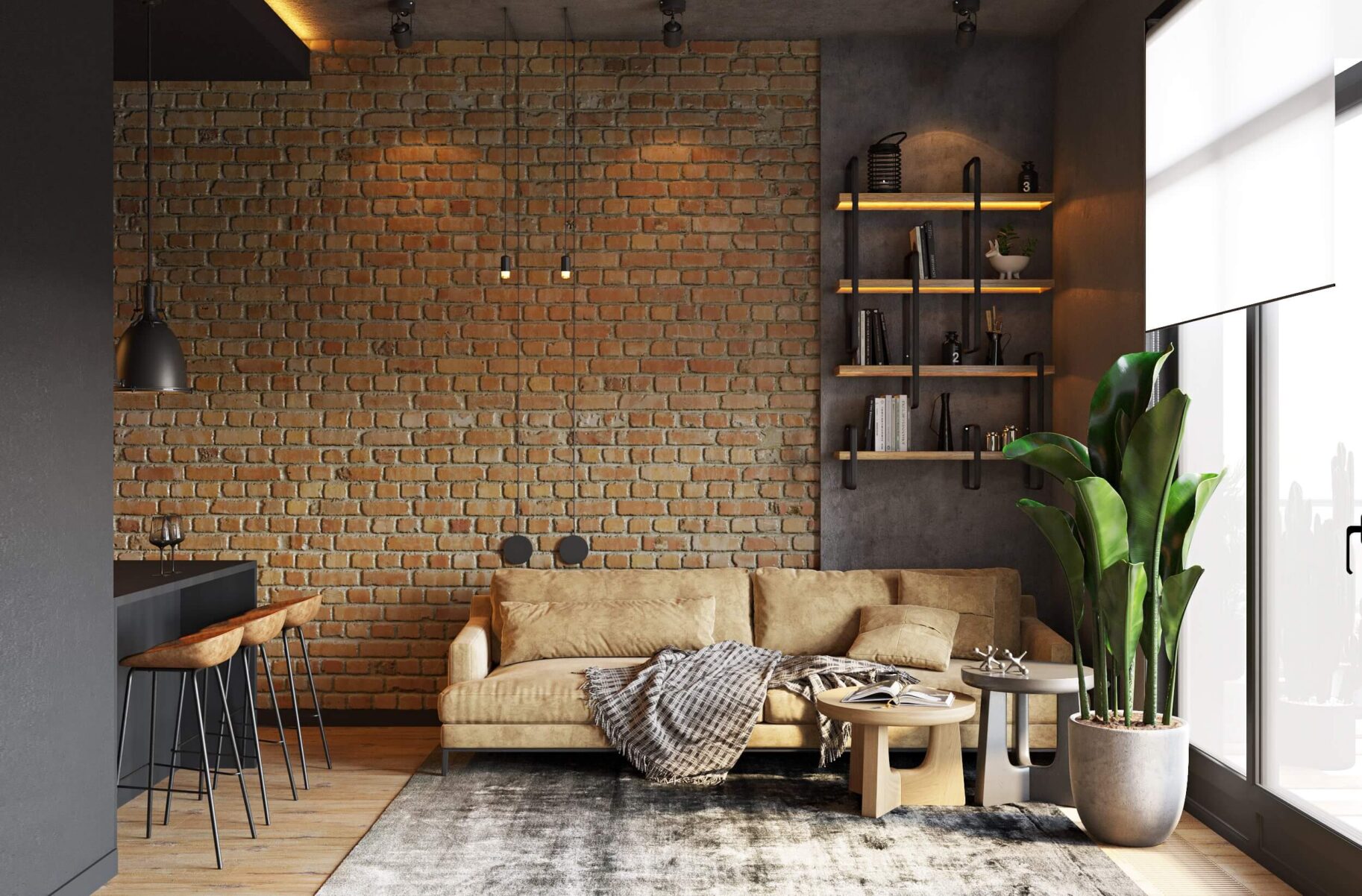 Various shades of brown, including beige, look great in loft style. They make the atmosphere cozier and more comfortable, especially in small rooms.