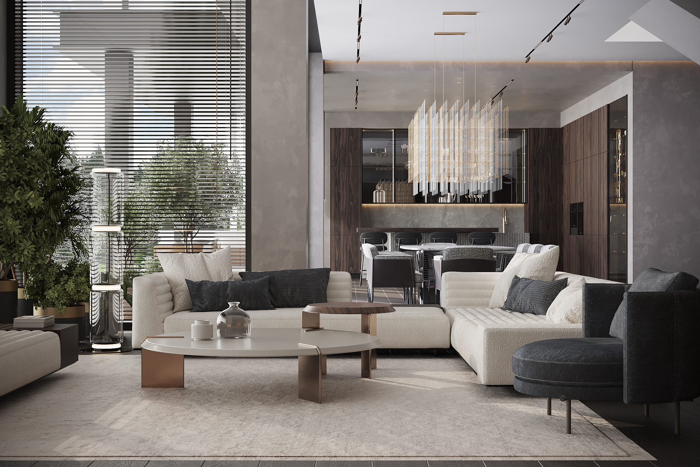 Ideal flooring options are concrete-like floors, textured parquet. Tiles also look great. You can combine several different materials to create accents or define zones in a room.