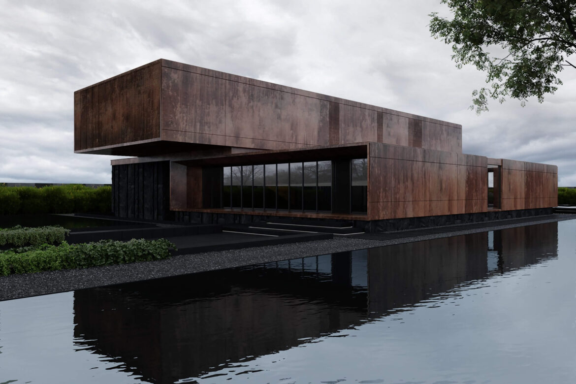 Главным декоративным элементом, который удачно подчеркивает как минималистичные формы, так и максимальную функциональность здания, выбраны сланец и высококачественный декоративный ржавый металл. Сочетание таких материалов создает урбанистическую картину будущего в настоящем времени.
